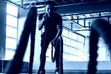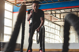 Muscular man in the gym with ropes doing exercises. Crossfit