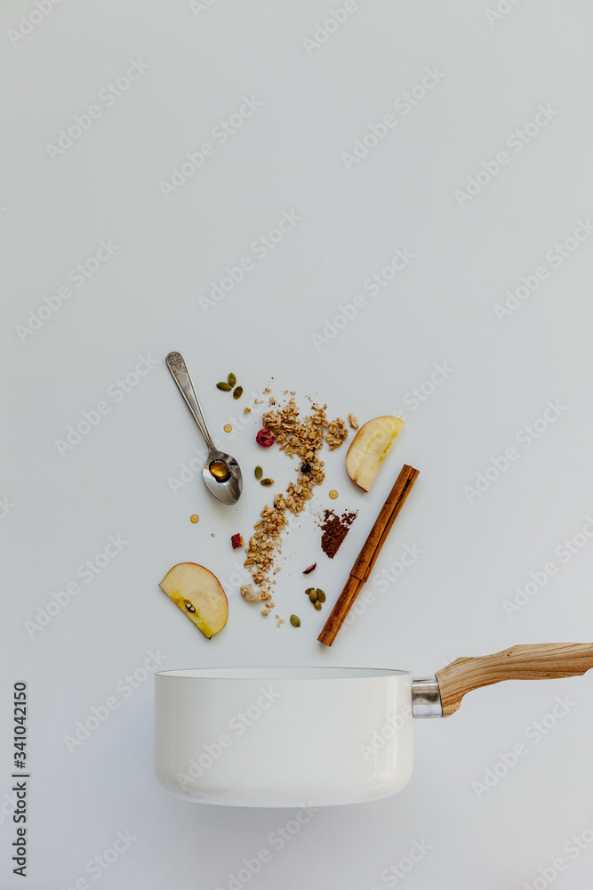 Apples, oat granola, cinnamon stick, pumpkin seeds, dried berries and syrup going into a white saucepan on a pastel white background