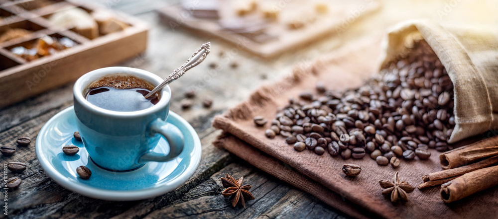 A cup of aromatic black coffee and coffee beans on the table. Morning Coffee Espresso for breakfast in a beautiful blue cup.