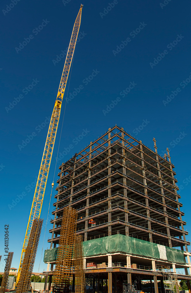 Commercial office building under construction with steel beams,large yellow tower crane and rebar. The weight of the beams is spray painted on the beams.The scene is against a blue sky