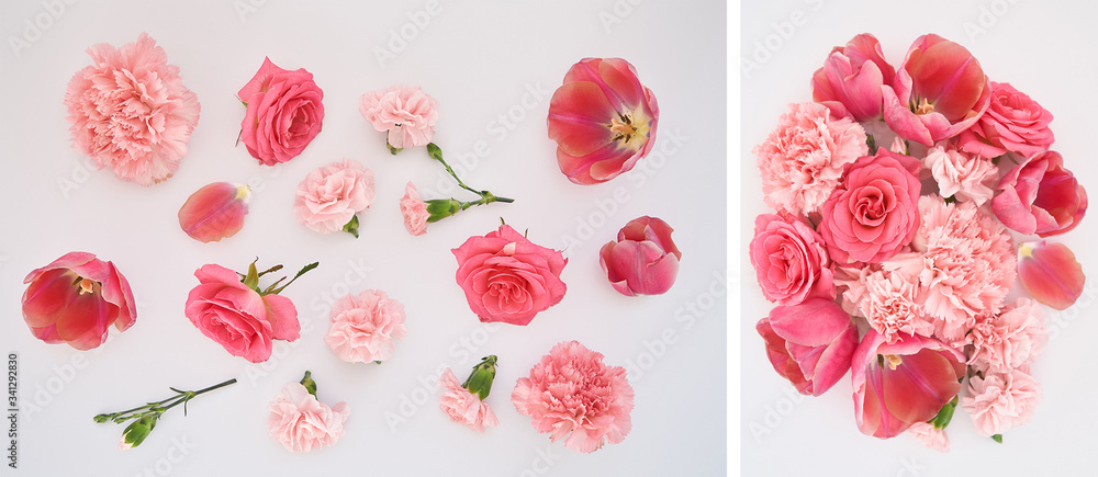 collage of pink spring flowers scattered on white background