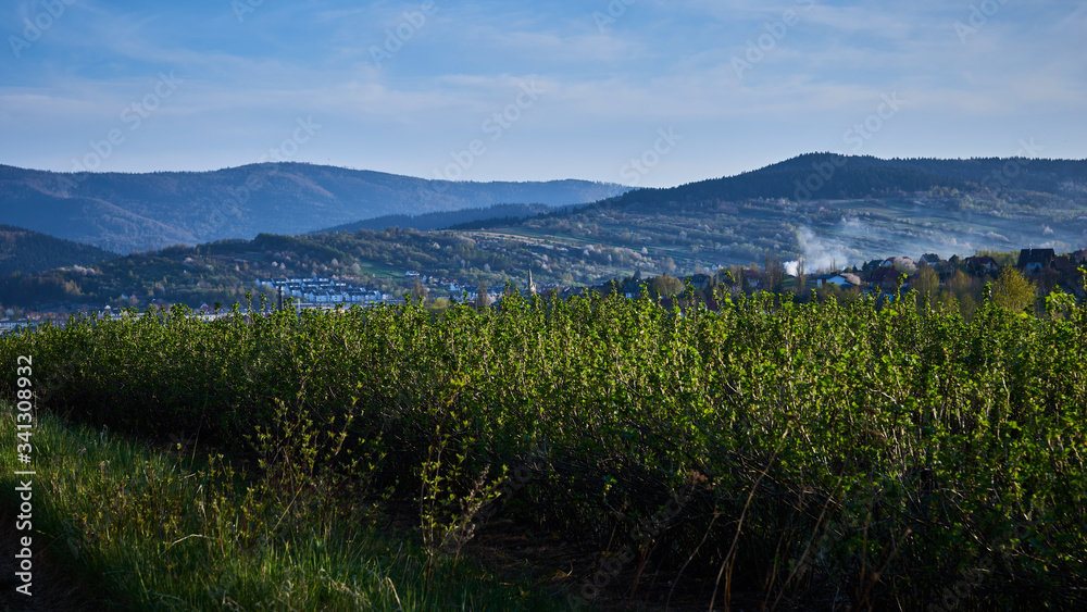 Panorama miasta Myślenice widziana z północnych wzgórz