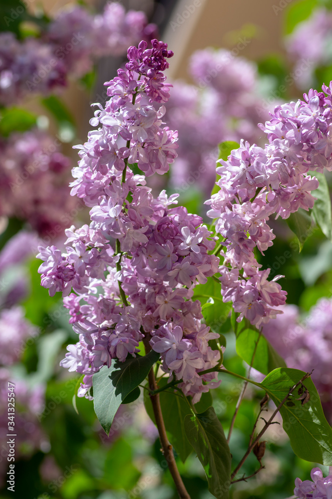 Syringa vulgaris violet purple flowering bush, groups of scented flowers on branches in bloom, common wild lilac tree