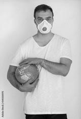 Man is wearing mask holding globe. Covid concept. Isolated white background