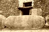 Spiral carvings on a kerb stone at the entrance to Newgrange chambered passage tomb
