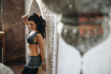 Belly dance costume. Costume for oriental dance. Eastern interior. Beautiful girl of eastern appearance. Dark long hair. Lessons Exercises. Movement in the dance. Bedleh or Beledi. Arab dance