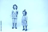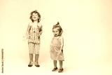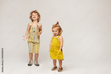 Two cute stylish children, boy and girl in fashionable summer clothes posing on a beige background. Isolated in full length with copy space