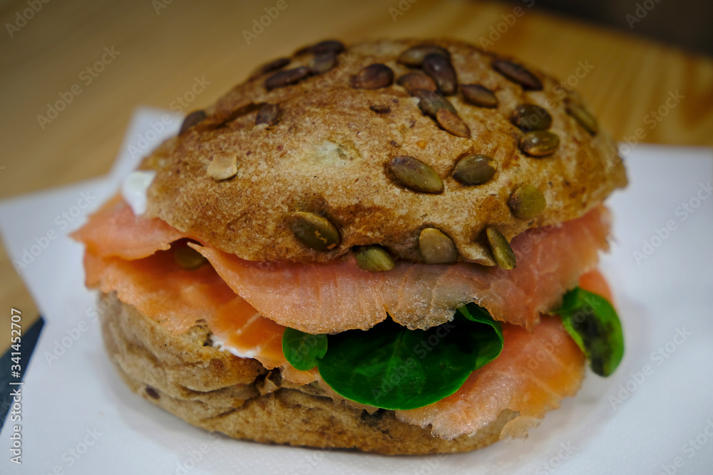 Delicious handmade sandwich with sunflower's seeds bread, salmon, salad and light creamy cheese.