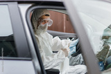 Man in protective suit, mask and gloves washing and disinfection of the steering wheel in the car, prevent infection of Covid-19 virus, contamination of germs or bacteria. Concept coronavirus pandemic