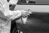 Close up of hand disinfecting door handle of a car. Antiseptic, disinfection, cleanliness and healthcare. Concept of the coronavirus pandemic COVID-19.