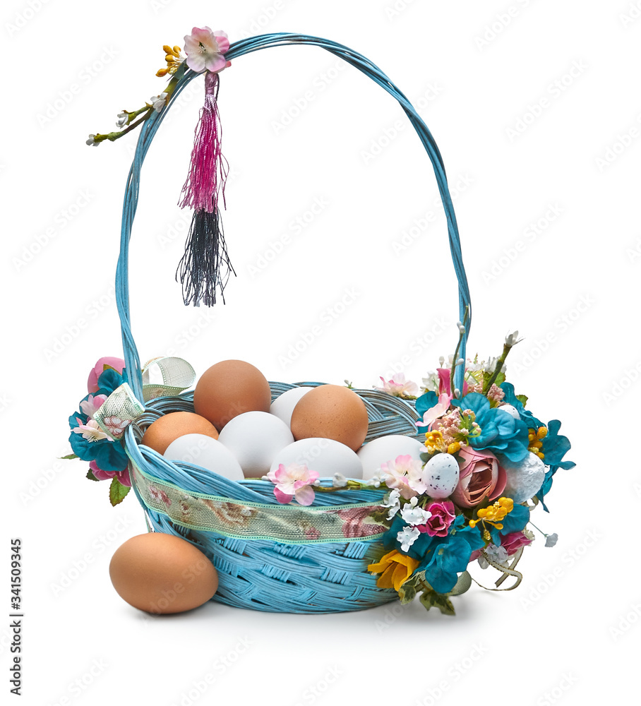 Easter basket with eggs and flower arrangement on a white background