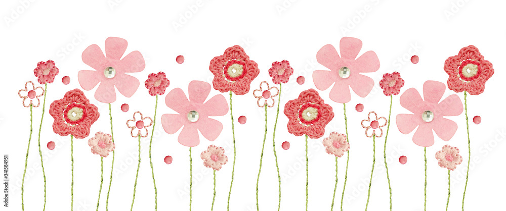 Handmade crochet, embroidered and felt flowers for children's cloth decoration in a seamless border