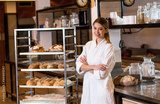 Portrait of young female baker standing at bakery.