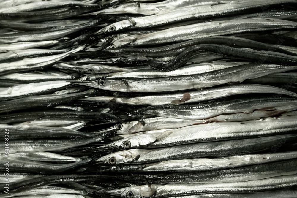 Needle fish in a box at the fishing market. Selling fresh food. Seafood, delicacy. Gourmet cuisine.