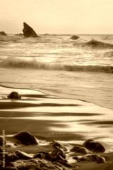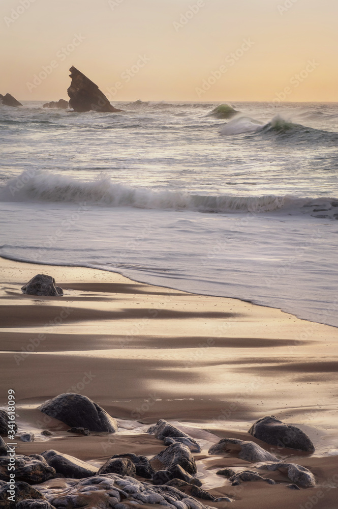 beautiful sandy atlantic ocean beach on sunrise. Algarve, Portugal