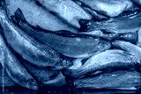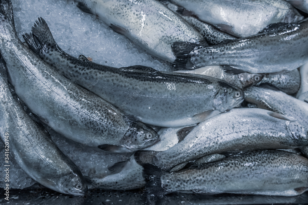 Trout, salmon in a box at the fishing market. Selling fresh food. Seafood, delicacy. Gourmet cuisine.