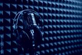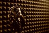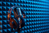 Studio condenser microphone with professional headphones acoustic panel