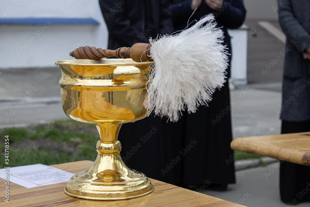 Holy water bowl and sprinkler, consecration on a Church holiday with Holy water.
