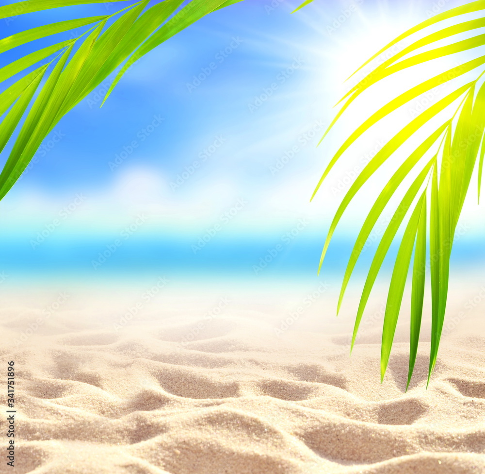 Summer sand beach background. Palm leaf, sea and sky. Summer concept.