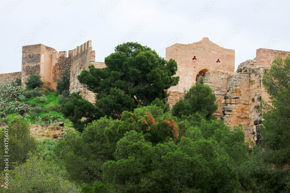 Wall and tower of old medieval Sagunto fortress on a hill in Spain surrounded by green forest