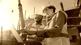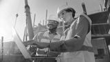 Two Specialists Inspect Commercial, Industrial Building Construction Site. Real Estate Project with Civil Engineer, Investor Use Laptop. In the Background Crane, Skyscraper Concrete Formwork Frames