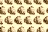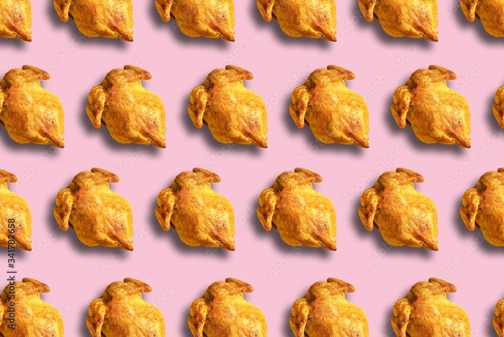 Colorful pattern of roasted chicken or turkey on pink background. Top view. Creative design for packaging. Food seamless pattern. Thanksgiving day concept.