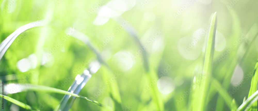Banner with closeup of fresh green grass for spring site design. Natural summer greenery background. Meadow pasture with blur soft focused bokeh effect. Floral macro textured abstract background