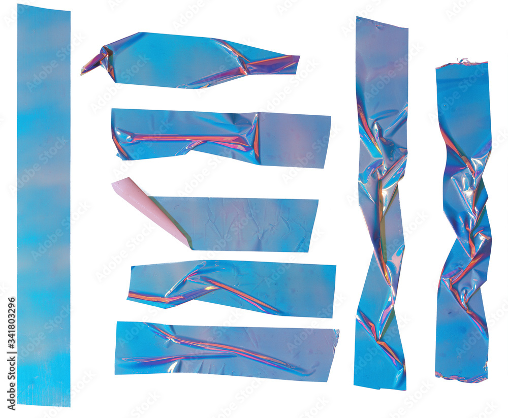 Shiny blue crumpled stickers. Cool set of metallic holographic sticky tape shapes isolated on white background. Holo glitter stripes or snips.