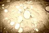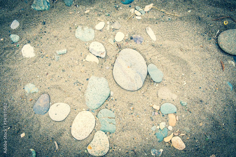 Background of sea pebbles. Abstract wallpaper of stones on the ocean. Multi-colored pebbles.