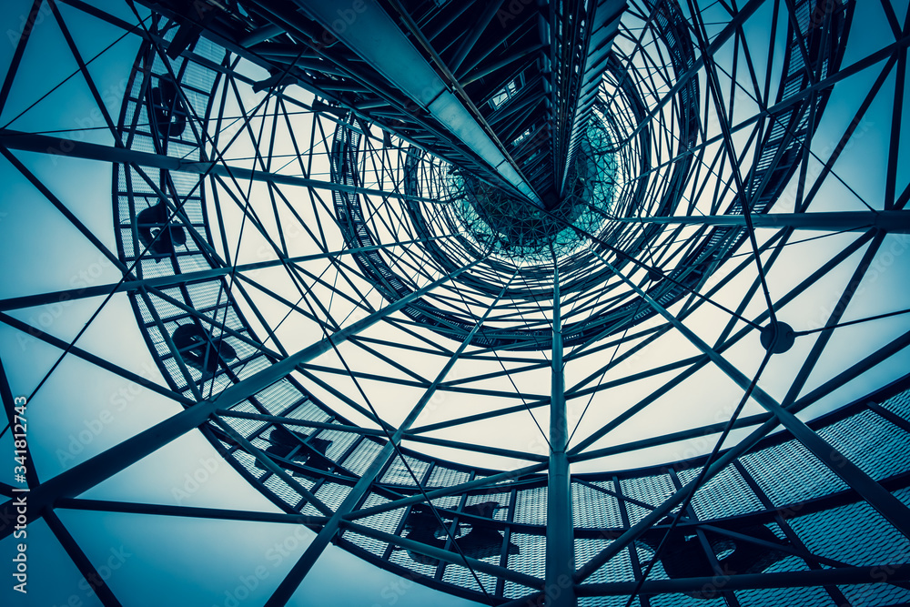 Steel structure of the observation tower in Batumi. Iron pipes create a futuristic image of the structure. Web of metal. View from the bottom up. Day Cloudy.