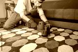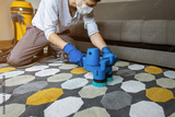 Male worker removing dirt from carpet with professional vacuum cleaner indoors