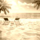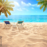 Summer sandy beach with blurred sea background and beach chair and coconut tree Montage of summer relaxation background
