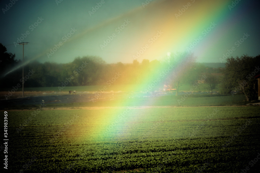 Auf dem von einem Sprinkler bewässerten Feld bildet sich ein Regenbogen