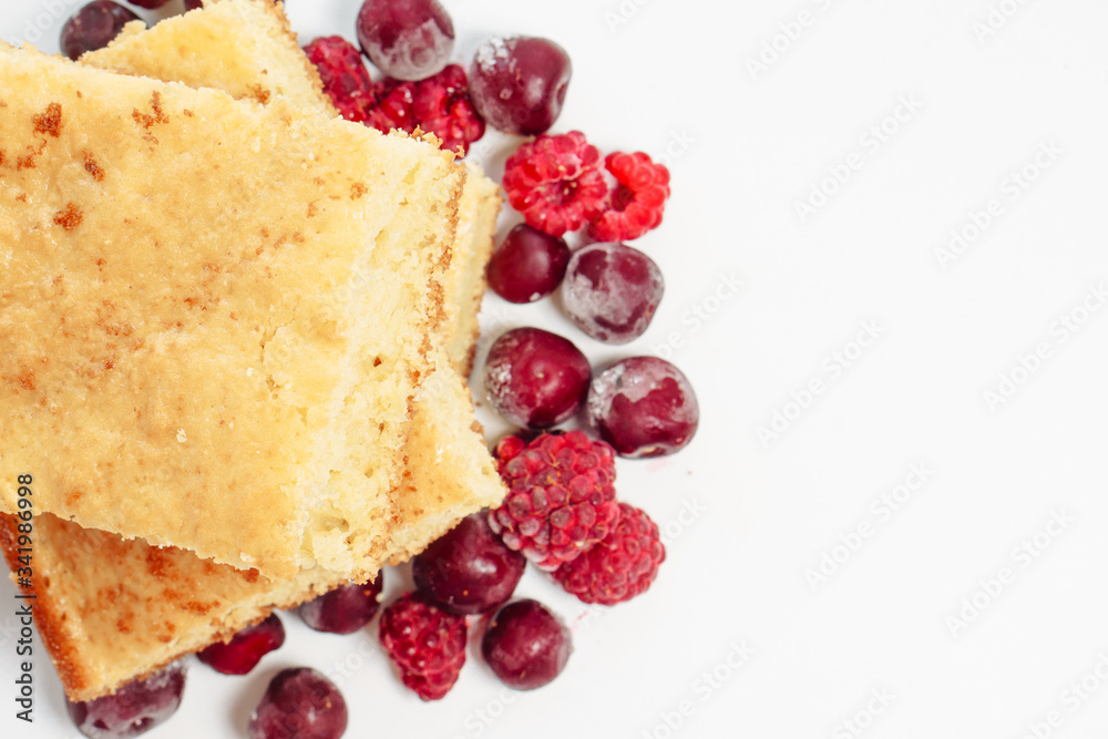Semolina cake with raspberries and cherries isolated on white background