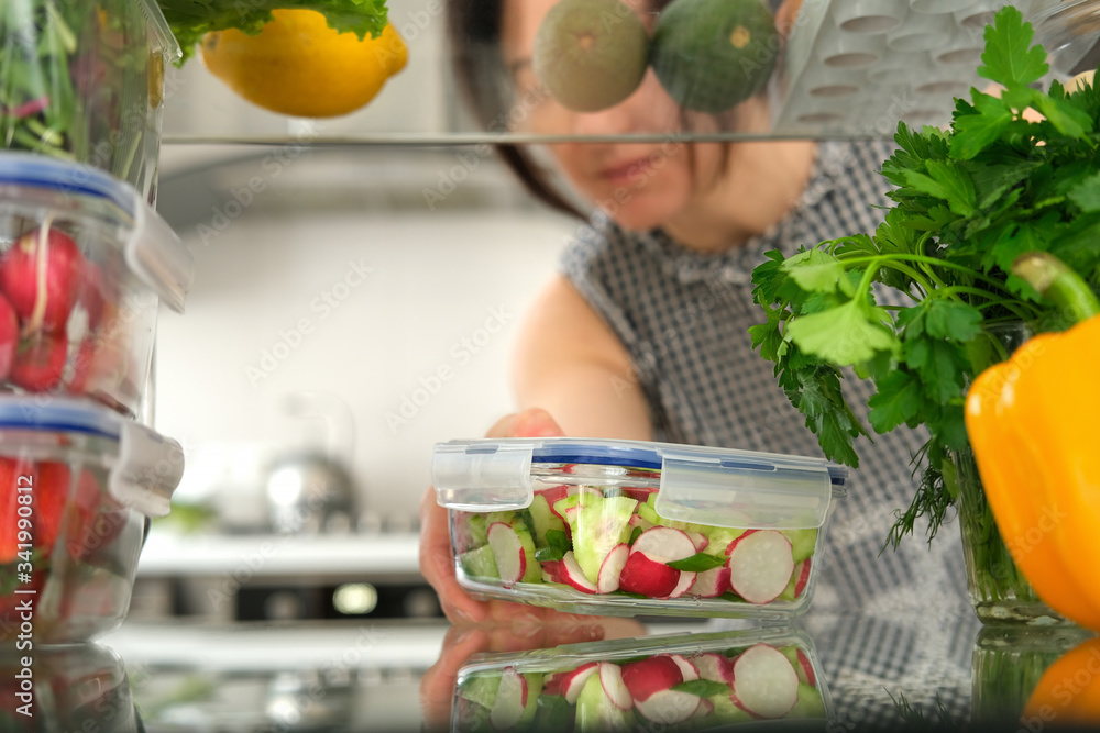 Woman looking inside a fridge full of food and choosing a salad in the container.
