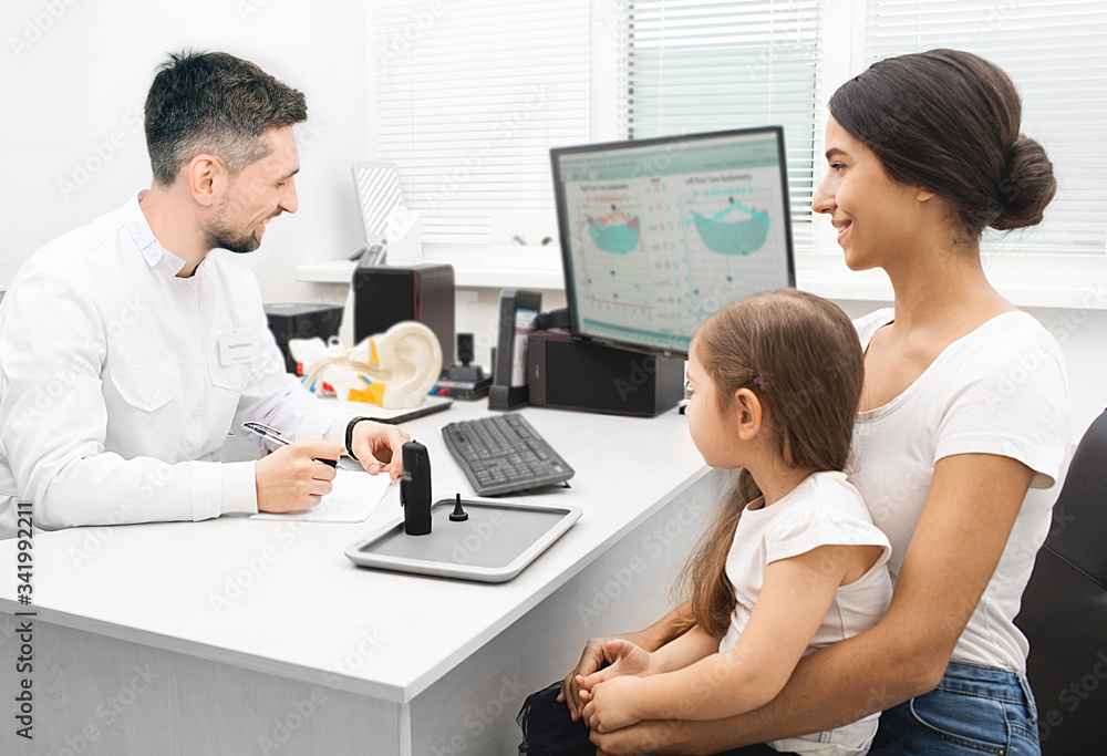 Mom with a child during consultation with an audiologist have a consultation.Hearing exam and treatment of hearing