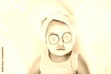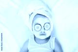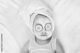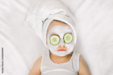 Spa procedures for a little cute baby girl in white bath towel with cucumbers on her eyes lying on white background. Funny baby wrapped in towel, with facial mask and cucumber slices on eyes
