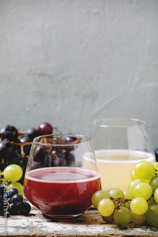 Traditional New european low alcohol red and white wine Federweisser or Neuer Wein, Burcak, Vin bourru in glasses with black and green grapes bunches on old white wooden table. Copy space.