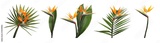Set with beautiful Bird of Paradise tropical flowers and green leaves on white background. Banner design