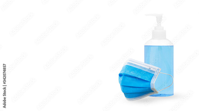 Alcohol Gel Hand Sanitizer and medical Mask on white background