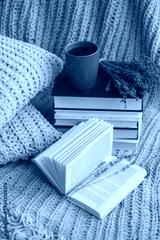 Background of blue hand-knit plaid and pillows in cosy home with dried bouquet of lavender flowers, books, mug of coffee, garland.