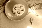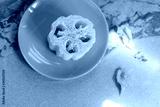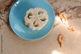 Luffa sponge on a ceramic blue trowel. Background sand and craft paper.