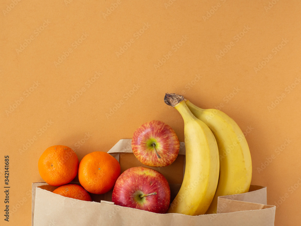 Eco paper bag with fruit banana, apple, tangerine on brown background. Concept of donation food, delivery service. Flat lay, top view, copy space