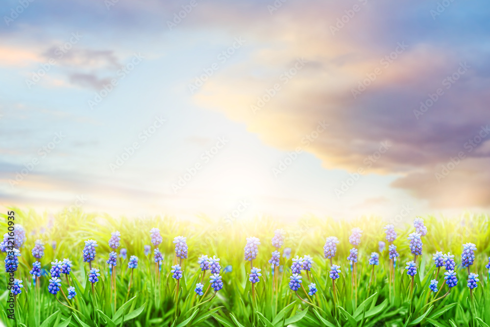 spring summer blue flowers in the sunlight on the background of the sky, macro. a natural landscape with a copy of the space.
