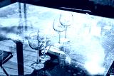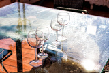 Terrace patio in Italy with four wine glasses on empty glass table with transparent view in winery or vineyard
