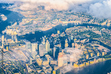 Aerial high angle bird's eye view from airplane over city of London Canary Wharf in United Kingdom with terraced houses buildings and cityscape skyscrapers