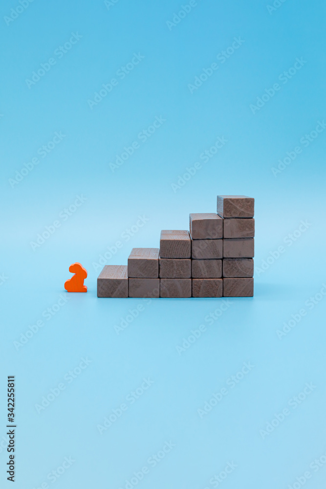 The beginning of the difficult path to success concept, wooden rabbit before climbing up