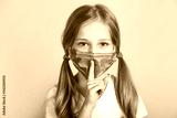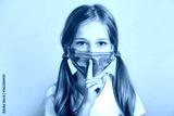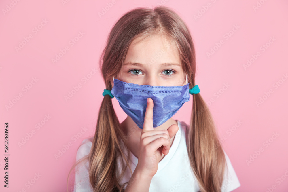 Kid with protective face mask shows shh sign on color background