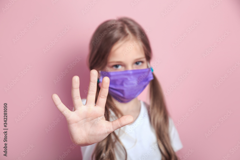 Portrait of kid with face mask show hands gesture for stop corona virus outbreak