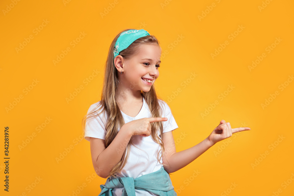 Cheerful cute little girl pointing on copy space at side on yellow background